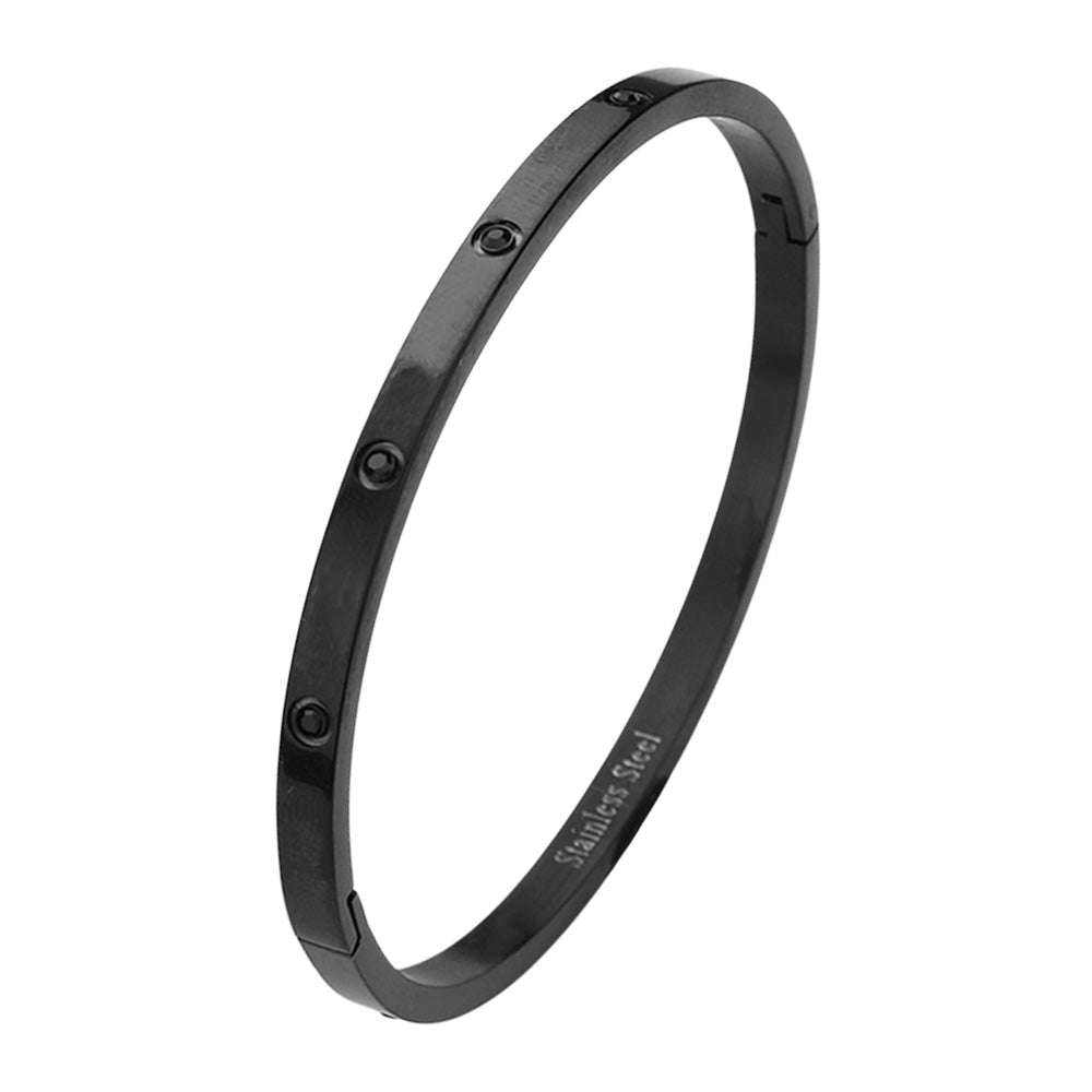 • This stainless steel bangle features a sleek, polished design adorned with sparkling crystal accents for a refined touch. Its slim profile makes it perfect for stacking or wearing solo, offering timeless elegance and durability that effortlessly enhances both casual and formal styles.